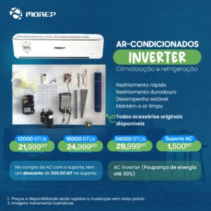 Com o Morep Air Conditioner 12K BTU INV AC, poderá desfrutar de um ambiente fresco e agradável durante todo o ano. A tecnologia Inverter não só proporciona uma climatização rápida e eficaz, como também reduz os custos mensais de energia, tornando-se numa escolha sustentável e económica. A função de desumidificação melhora a qualidade do ar, indispensável para um ambiente mais saudável, enquanto o controlo remoto oferece total conveniência e conforto ao utilizador.