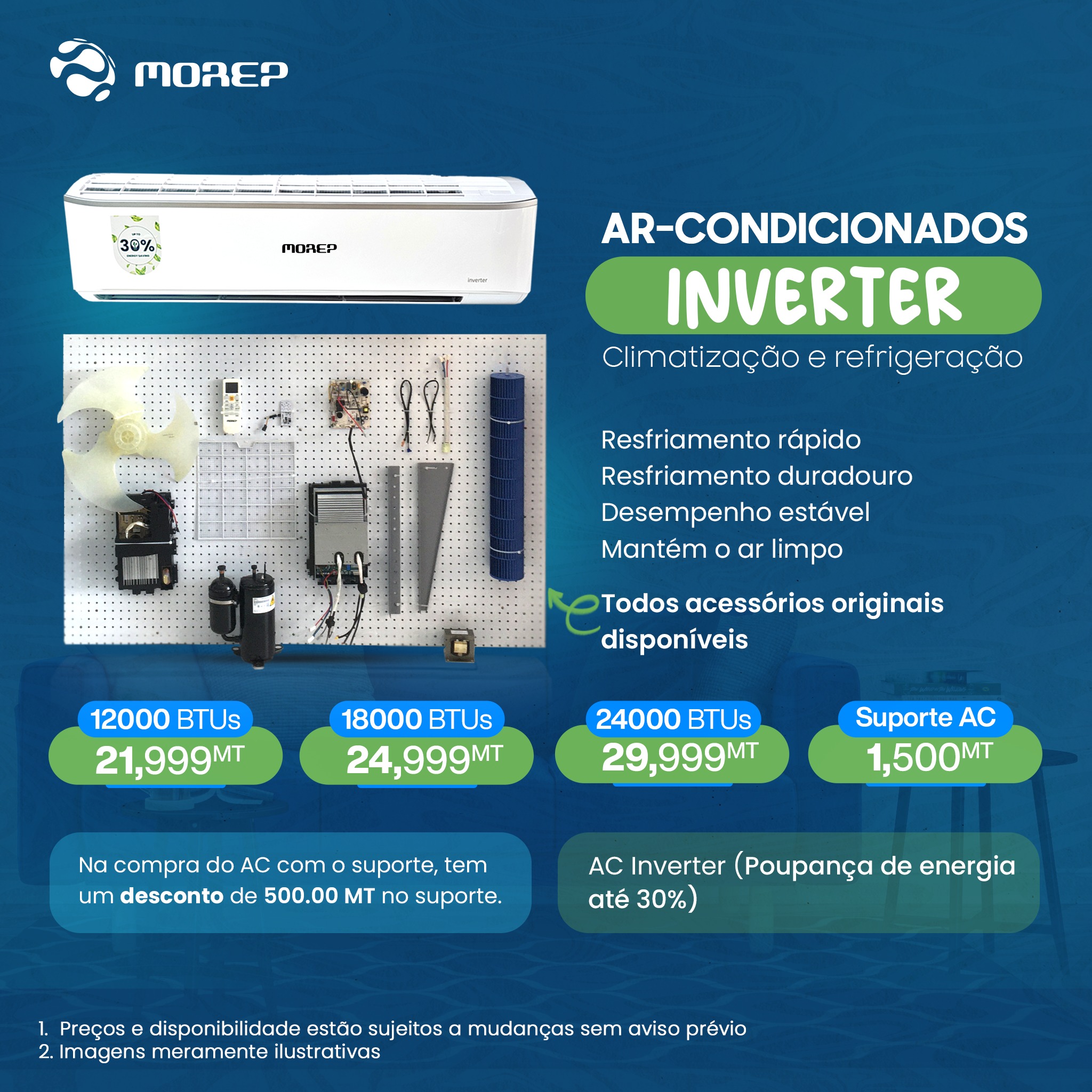 O Morep Air Conditioner 12K BTU INV AC é uma solução inovadora e eficiente para climatizar o seu ambiente com conforto e economia. Com tecnologia moderna, este ar condicionado garante uma temperatura agradável em qualquer espaço, oferecendo, assim, uma experiência de utilização superior.